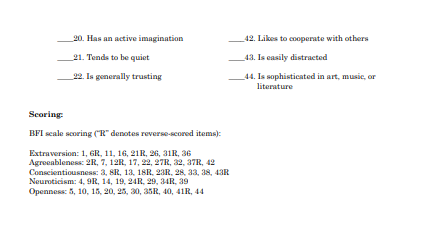- Openness: Items 5, 10, 15, 20, 25, 30, 35R, 40, 41R, 44