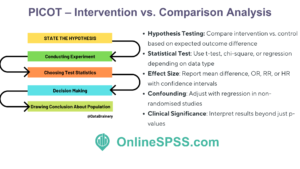 The Intervention (I) and Comparison (C) elements of PICOT set up the core comparison that will be analyzed statistically. Whether in a trial or observational study, researchers will be comparing outcomes between two or more groups (e.g. Intervention vs. Control) or between those exposed vs. unexposed. Key statistical considerations and methods include: