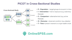 Here Time is a single measurement (present time) and the “Intervention” is not a treatment but a risk factor or trait. Cross-sectional PICOT questions help define what data to collect in a survey or prevalence study. These studies are relatively fast and inexpensive since they gather data once. However, because exposure and outcome are measured together, it’s hard to infer causality, and there can be recall bias if participants are asked about past behaviors.