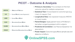 If you’re conducting PICOT-based research and require statistical expertise, OnlineSPSS.com is here to assist. Our specialists simplify complex statistical tasks, delivering clear, publishable results tailored specifically to your PICOT framework.