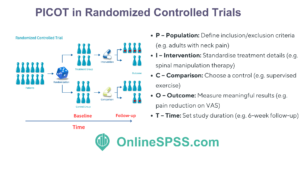 Intervention: The trial’s experimental arm corresponds to the Intervention. This could be a new drug, therapy, or procedure. The PICOT framework forces clarity on what exactly is done: e.g. “cervical spinal manipulation therapy, applied 1–3 times per week for 2–6 weeks”. In planning an RCT, the intervention must be standardized and consistently delivered. PICOT helps describe it in detail (dose, frequency, technique) so that it’s reproducible.
