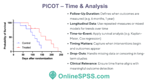 Follow-Up Duration: Time might indicate how long participants are observed. If an outcome is assessed at a specific time point (e.g. healing at 8 weeks, mortality at 1 year), the analysis is often straightforward at that time (comparing groups at that endpoint). However, if some subjects are lost to follow-up before that time, researchers must consider censoring those data or use methods to handle missing data. The PICOT question’s Time frame helps determine the endpoint for analysis.